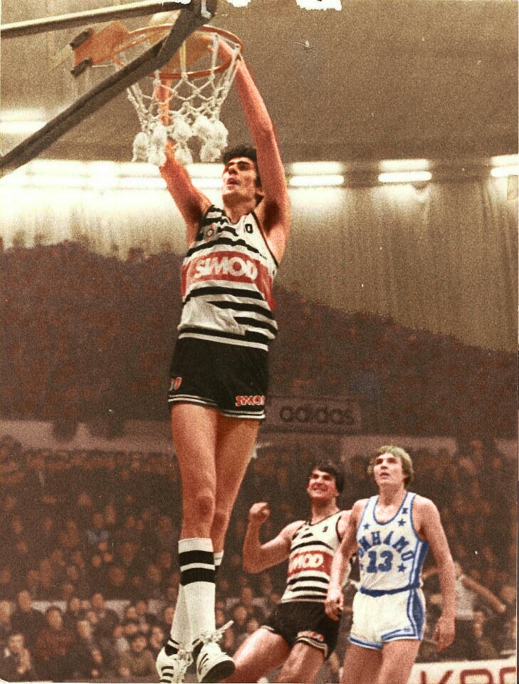Kup Radivoja Koraća 1982/83, Partizan - Dinamo (SSSR) 110-102. Milenko Savović zakucava, a u pozadini Goran Grbovic proslavlja pogodak...